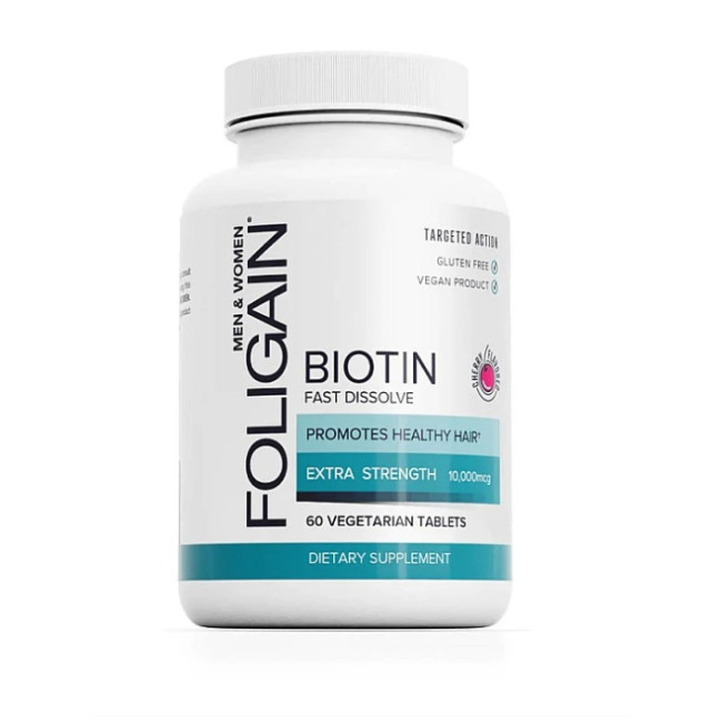 Добавката FOLIGAIN® Biotin от 10,000mcg с бързо разтваряне за по-здрава коса поддържа външния вид за по-здрава коса, кожа и нокти отвътре и отвън. Всяка таблетка е отличен източник на биотин, витамин B, който работи с тялото ви, за да поддържа цялостното здраве не само на вашите космени фоликули, но и на кожата и ноктите.