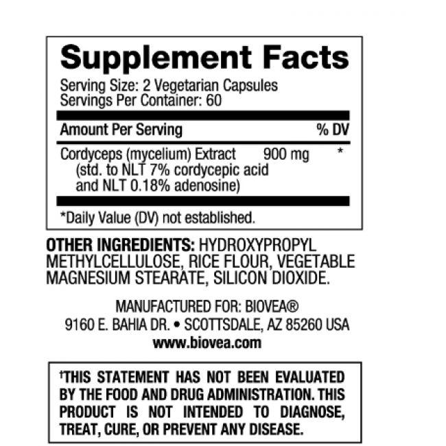 Основно намерен по високите места на Западен Китай, този оригинален планетарен продукт, Biovea Cordyceps използва специално подготвен мицел на кордицепс. Biovea Cordyceps осигурява същото количество екстракт от кордицепс CS-4 (стандартизиран до 0,1% аденозин), използван при фармакологични проучвания. Това се комбинира с мицелия на кордицепс, отглеждан върху органичен кафяв ориз от спори, първоначално събрани в Хималаите. Тази комбинация осигурява пълен спектър от важни съставки на кордицепс.